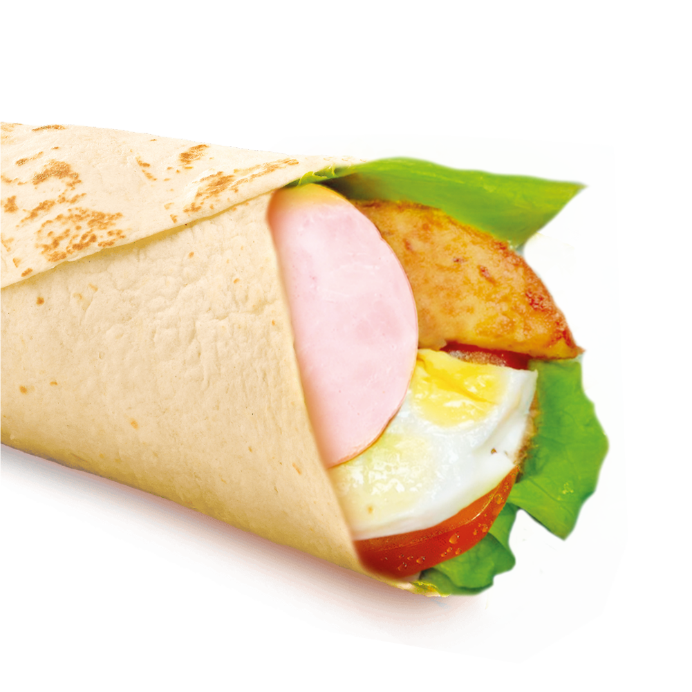Ролл с салатом айсберг и томатом в сочетании с пышным омлетом, поджаренной ветчиной и картофельными оладьями, в ароматной пшеничной лепешке, заправленной соусом дабл бургер