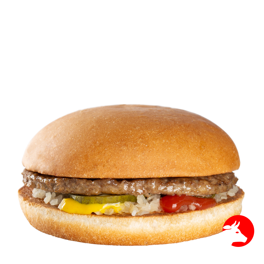 Бургер с сочной котлетой из говядины, нежной булочкой, заправленной горчицей, кетчупом, луком и кусочками маринованного огурца.