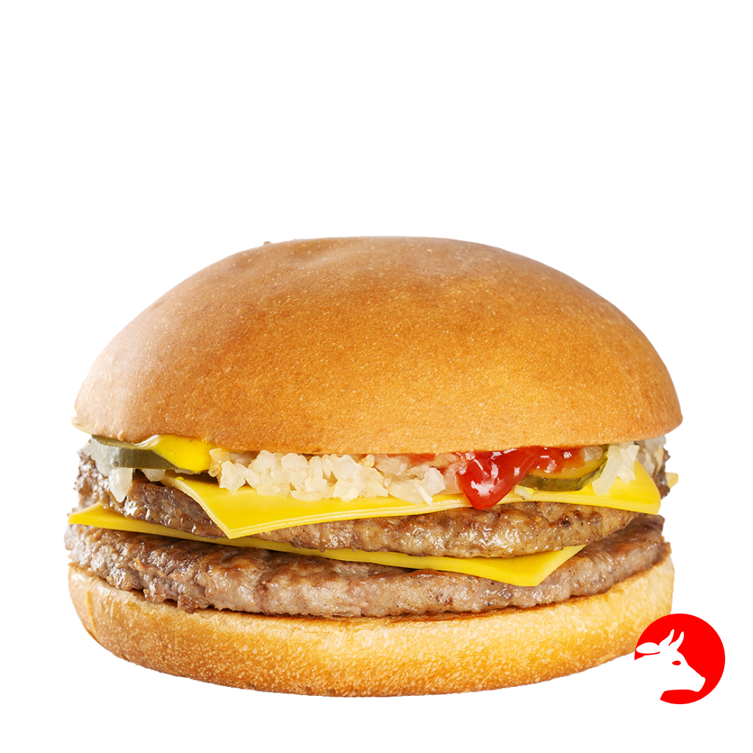 Бургер с двумя сочными котлетами из говядины, двумя ломтиками сыра чеддер, нежной булочкой, заправленной горчицей, кетчупом, луком и дольками маринованного огурца.