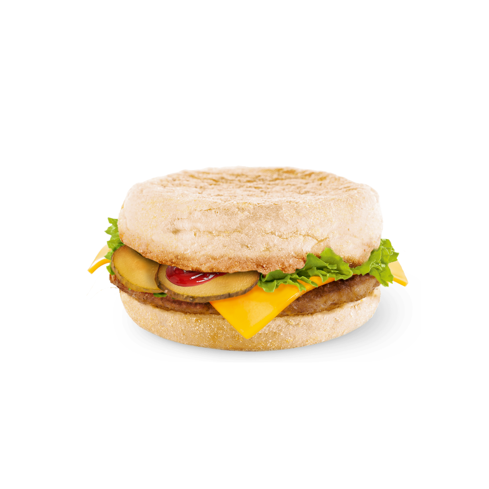 Нежная горячая булочка (английский маффин) с аппетитной котлетой из свинины, свежим салатом айсберг, маринованными огурцами, сыром чеддер, заправленная кетчупом