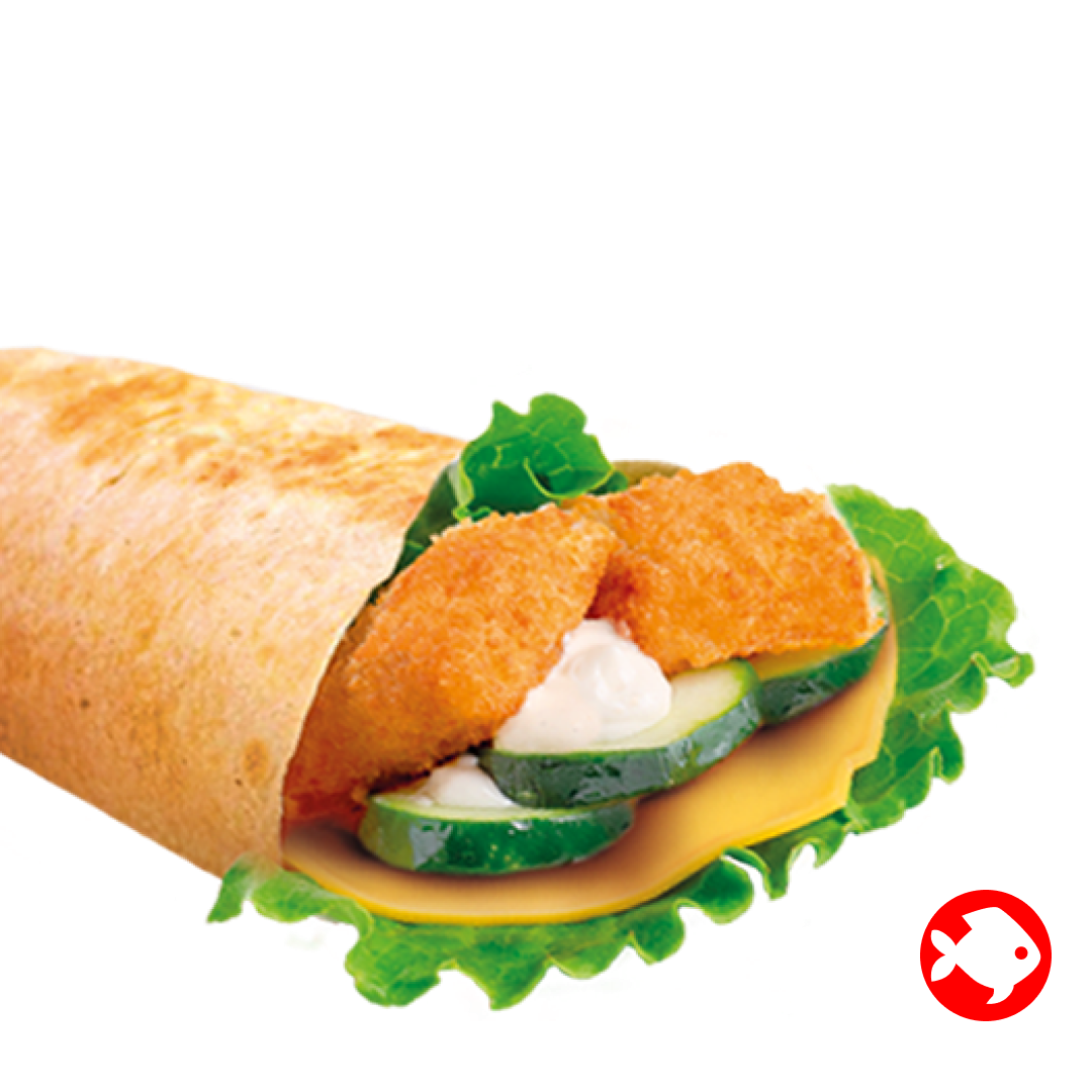 Ролл с нежнейшим филе минтая, ломтиком сыра чеддер, свежими огурцами и салатом айсберг . Все это в пшеничной тортилье, под соусом тар-тар.