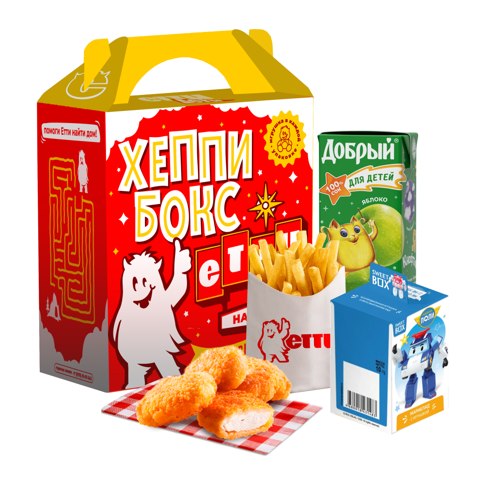 Наггетсы, картофель фри, сок в коробке детский на выбор, игрушка на выбор.