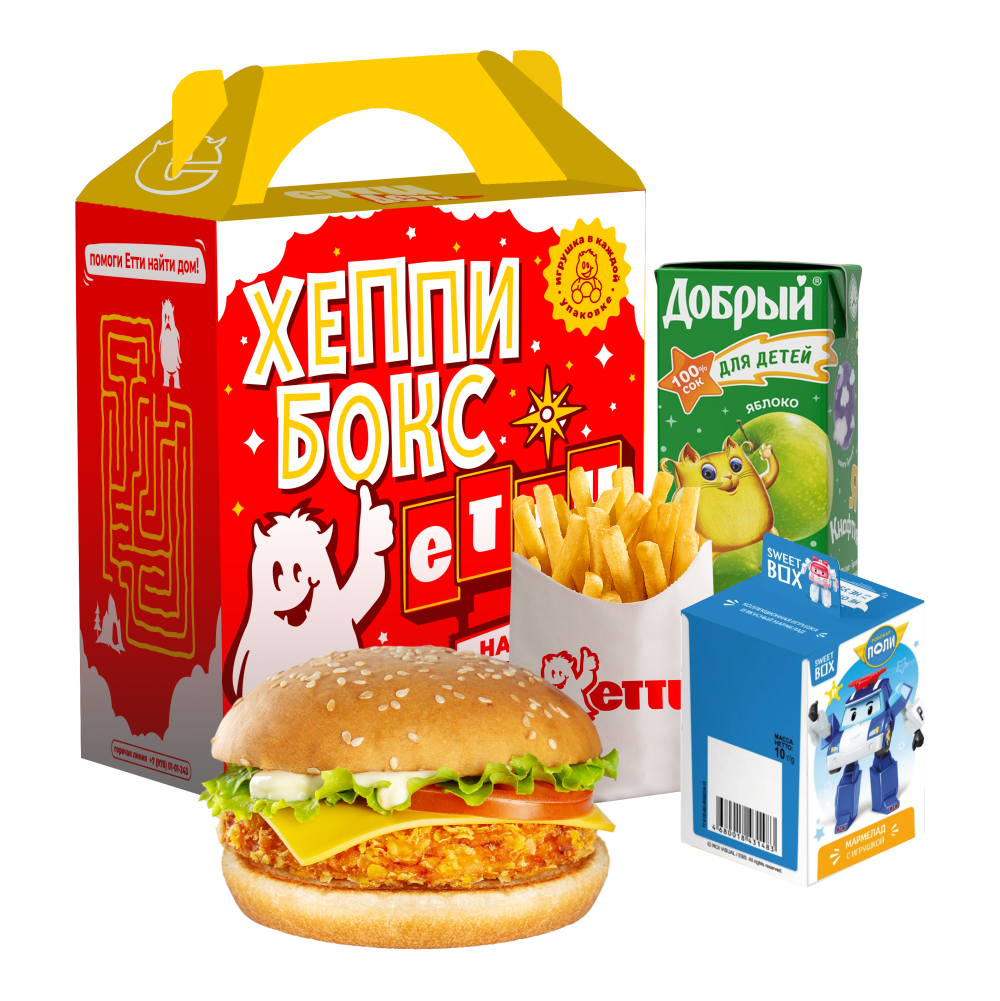 Чикенбургер, картофель фри, сок в коробке детский на выбор, игрушка на выбор.
