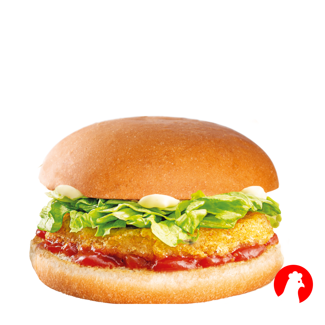 Сочная куриная котлета в хрустящей панировке, салат айсберг, майонез, кетчуп и карамелизированная булочка.