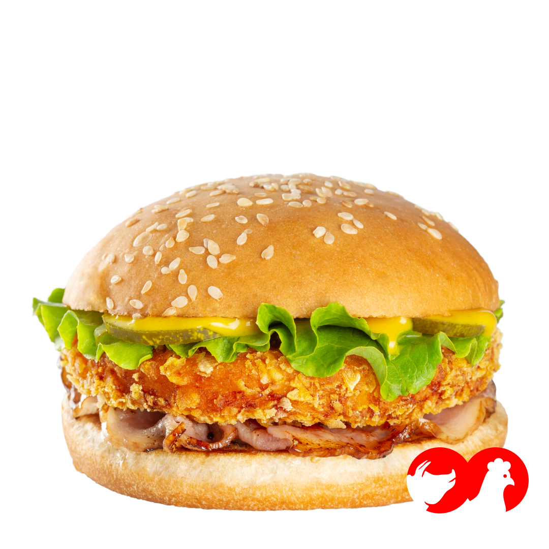 Бургер с хрустящей куриной котлетой, в сочетании с обжаренным до золотистой корочки беконом, свежим салатом айсберг и маринованным огурцом. Всё это в булочке с кунжутом, пропитанной горчичным соусом.